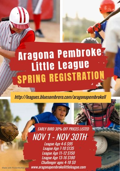 Registration is now online, please go to http://leagues.bluesombrero.com/aragonapembrokell create an account and register your player(s). Little League is now requiring all leagues to use Sports Connect to register players going forward. We will now be adjusting to using this site instead of in-person sign-ups. The site has the capabilities to upload all your paperwork as well as your volunteer forms for you to coach your child's team.