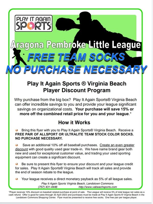 Pick up a flyer at the next registration, print it from Facebook, or Instagram to get your free socks and a discount on gear you may need this spring season at Play It Again Sports!!